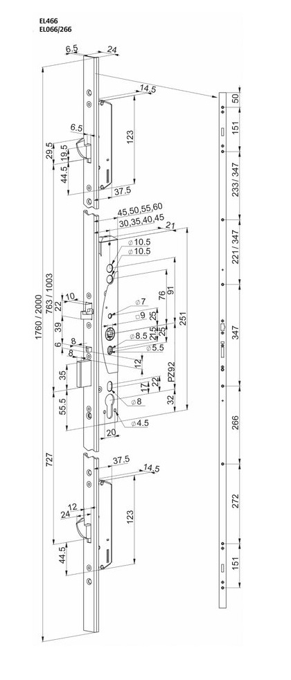 Panikový zámek se signalizací EL266 Multipoint - Samozamykací mechanická verze s elektrickou signalizací bez elektrického ovládání - stejná mechanická funkce jako EL066 s možností monitorovat funkci kliky, závory, klíče, dveří. Pro možnost využití monitorovací funkce je nutné k zámku přivést kabel EA218 nebo EA219.