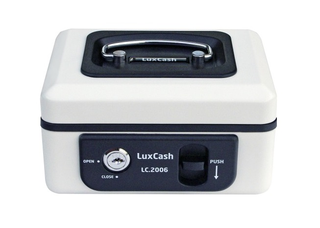 • Uzamykatelná pokladnička z ocelového plechu s blokací proti samovolnému zavření.