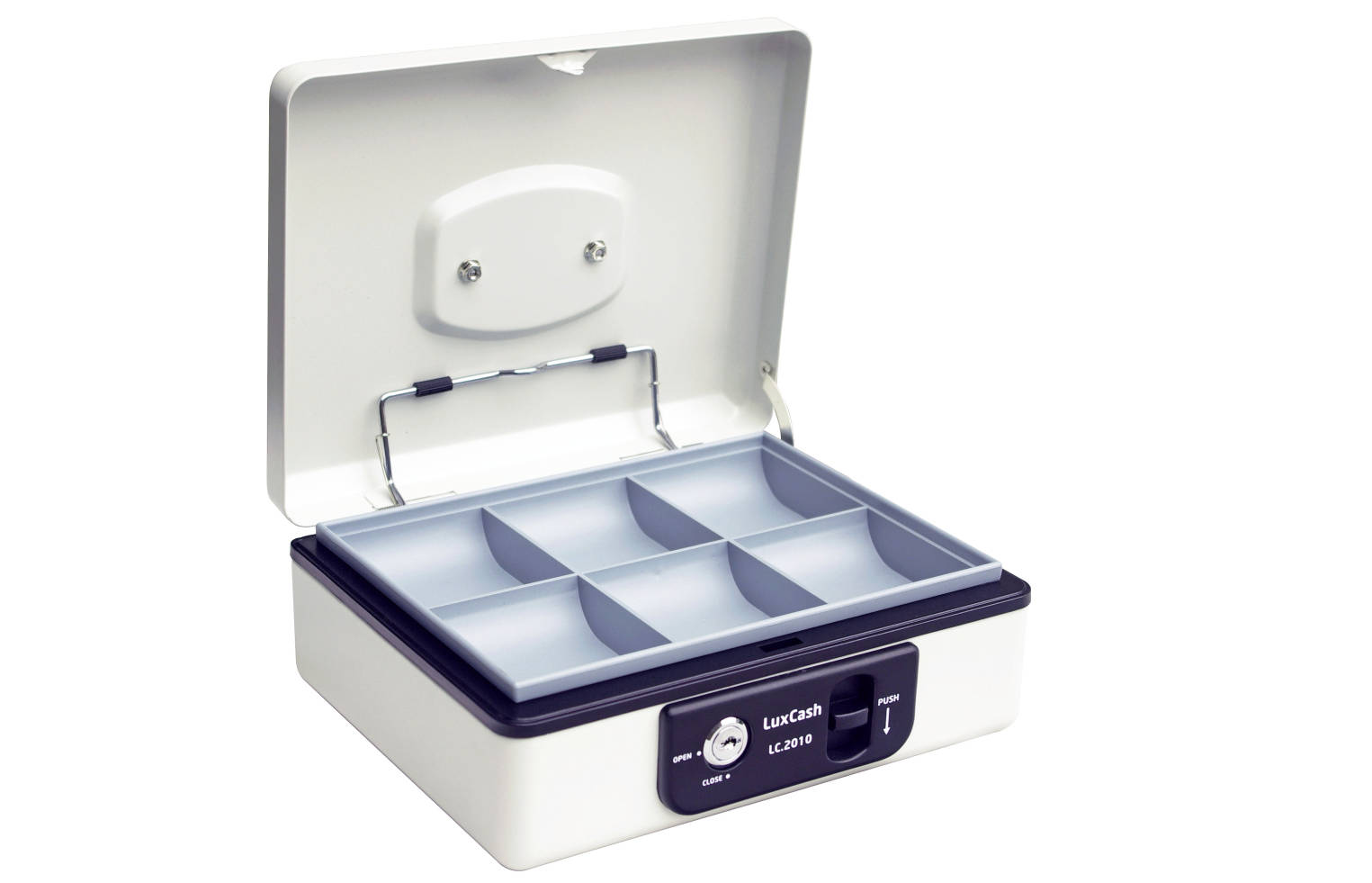 • Uzamykatelná pokladnička z ocelového plechu s blokací proti samovolnému zavření.