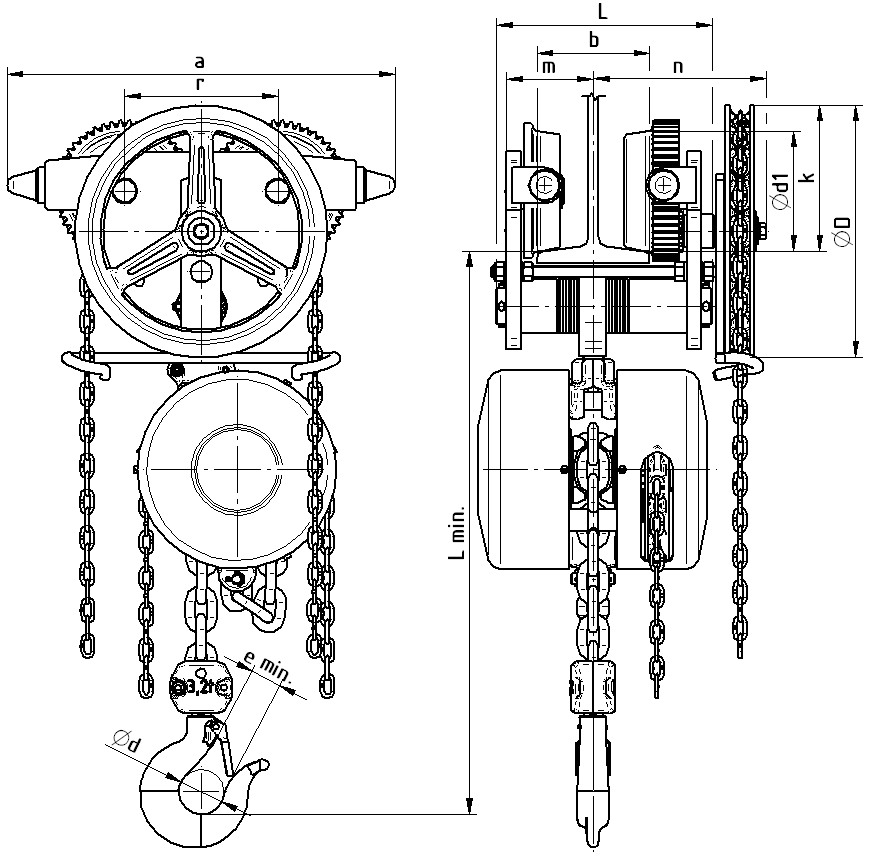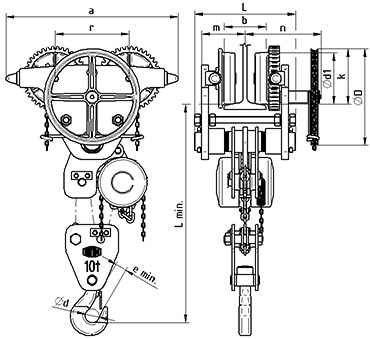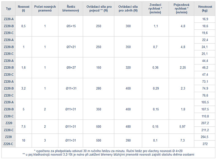 Pojízdný kladkostroj Z220/0,5-10 t se běžně vyrábí se základním zdvihem 3 m. Možnost volby zdvihu od 3 m do 12 m.