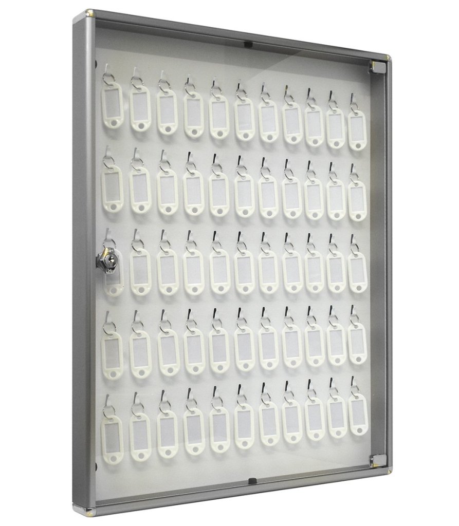 Skříňka na 56 klíčů prosklená, výška 670 x šířka 460 x hloubka 37 mm. Vyrobená z hliníkového profilu, uzamykatelná, hmotnost 5 kg.